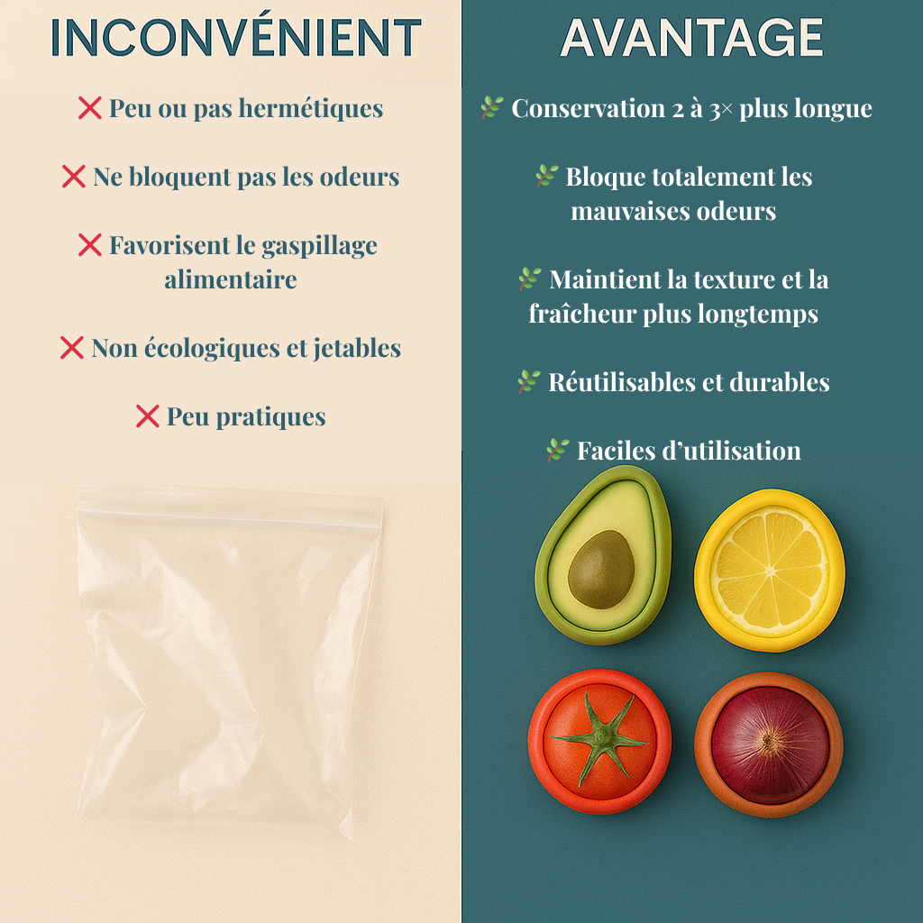 Idéal pour fruits et légumes coupés : avocat, citron, oignon, tomate… Fini le gaspillage et les odeurs au frigo.